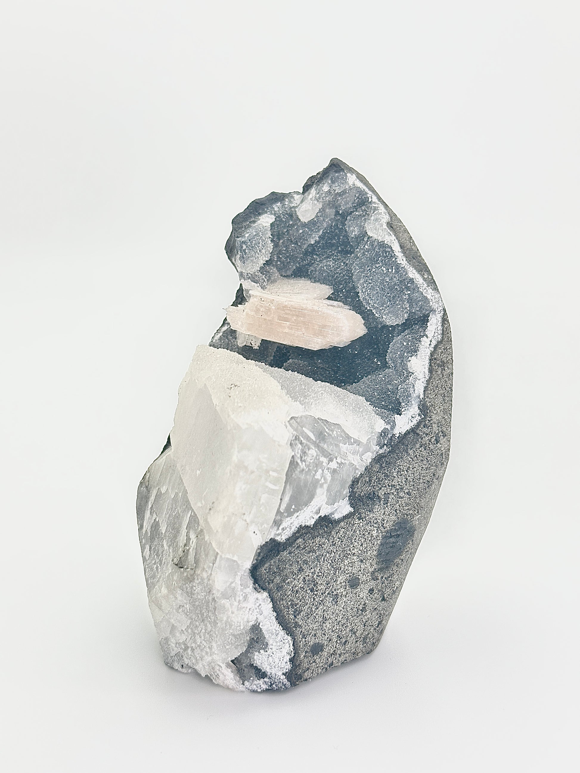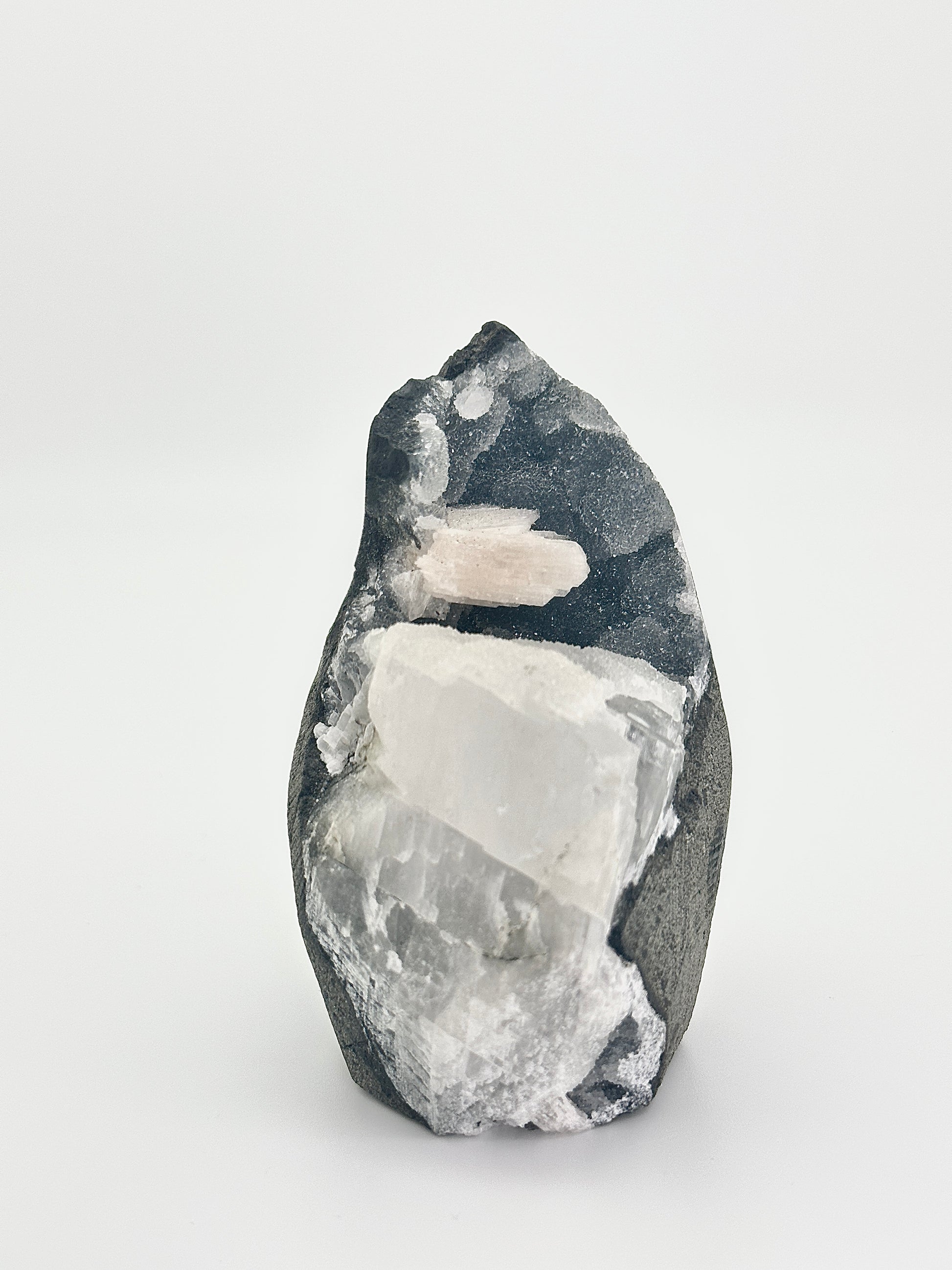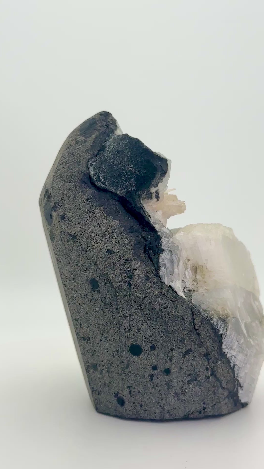 This stunningly rare combination of minerals is Black Chalcedony with Calcite and Stilbite