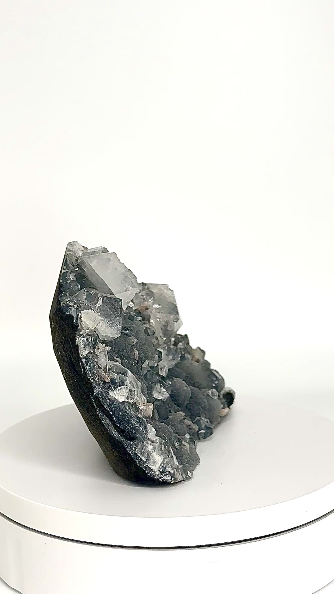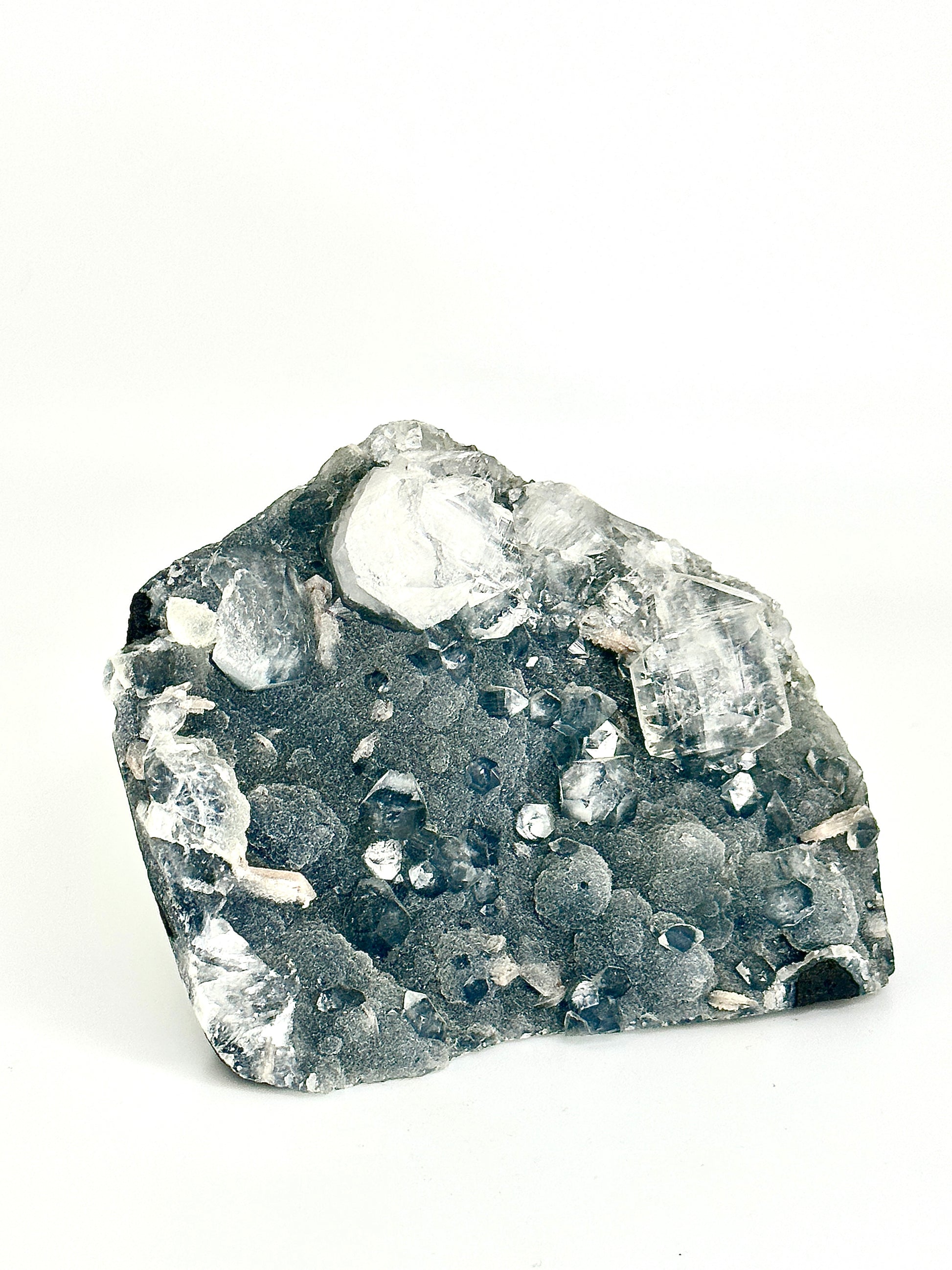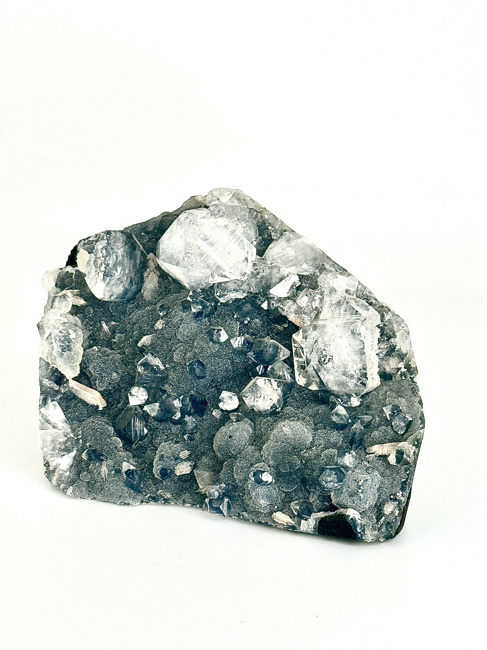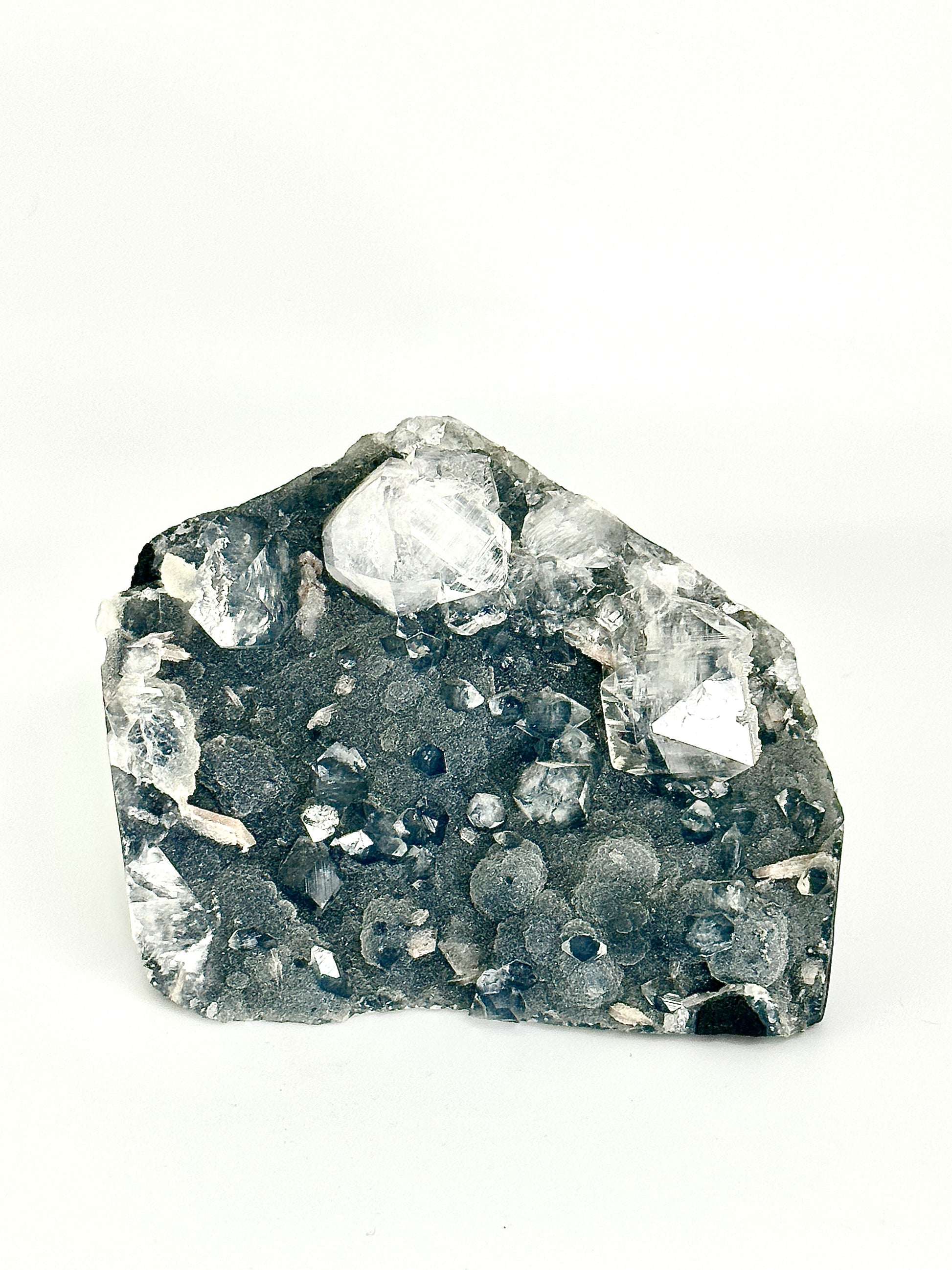 This absolute stunner is sparkly Druzy Botryoidal Black Chalcedony with high grade Diamond Apophyllite and Stilbite inclusions. The structures of this piece are an absolute marvel with numerous double terminated Apophyllite on top of collector quality Chalcedony and pristine Stilbite inclusions