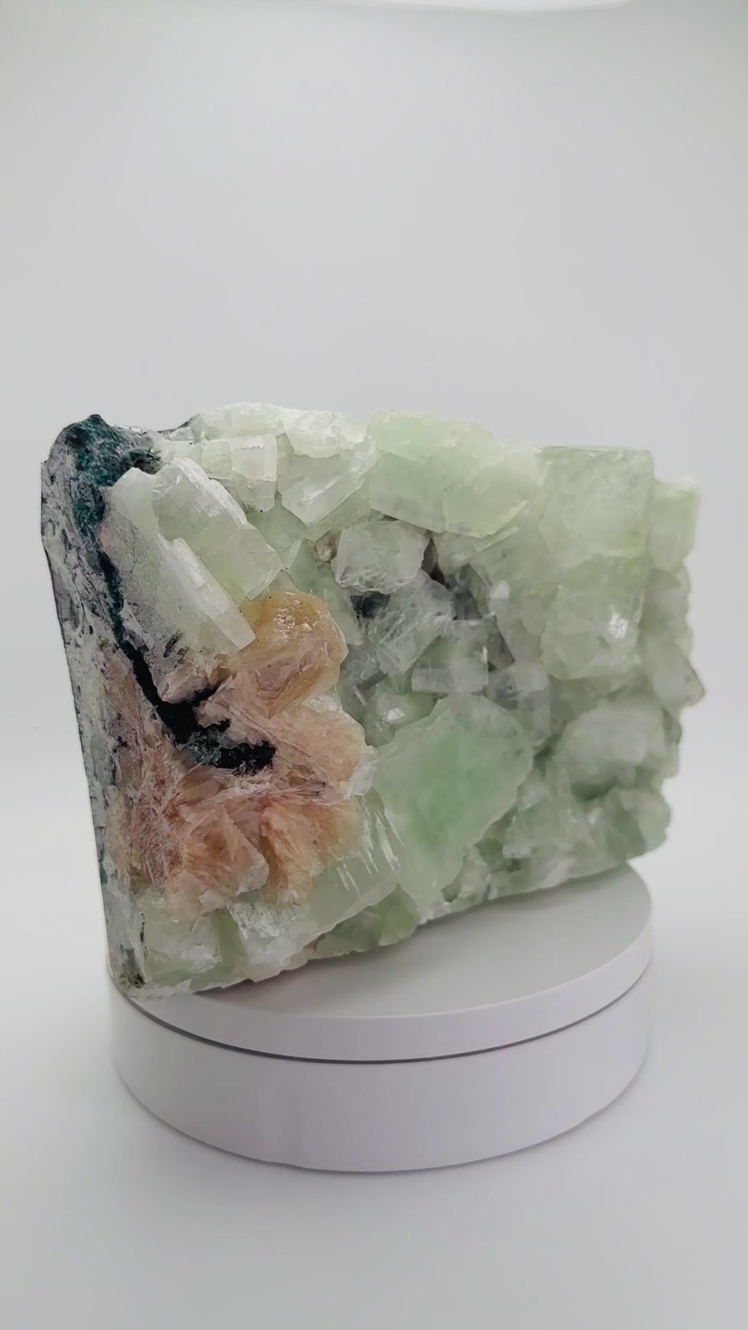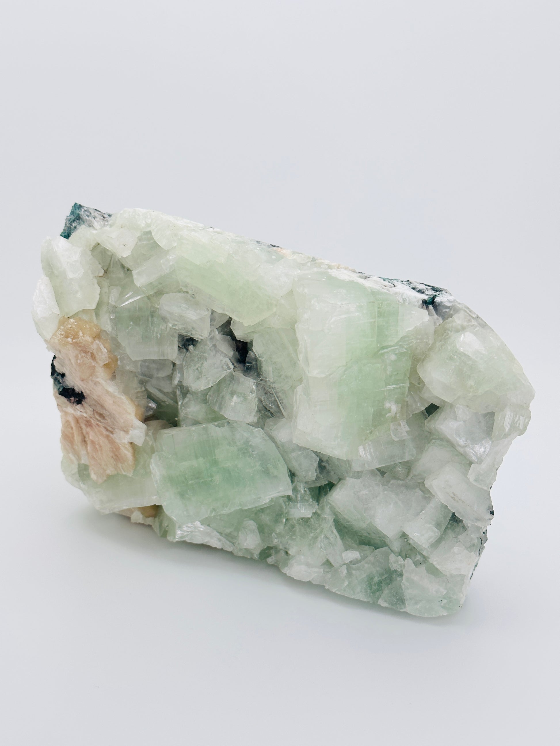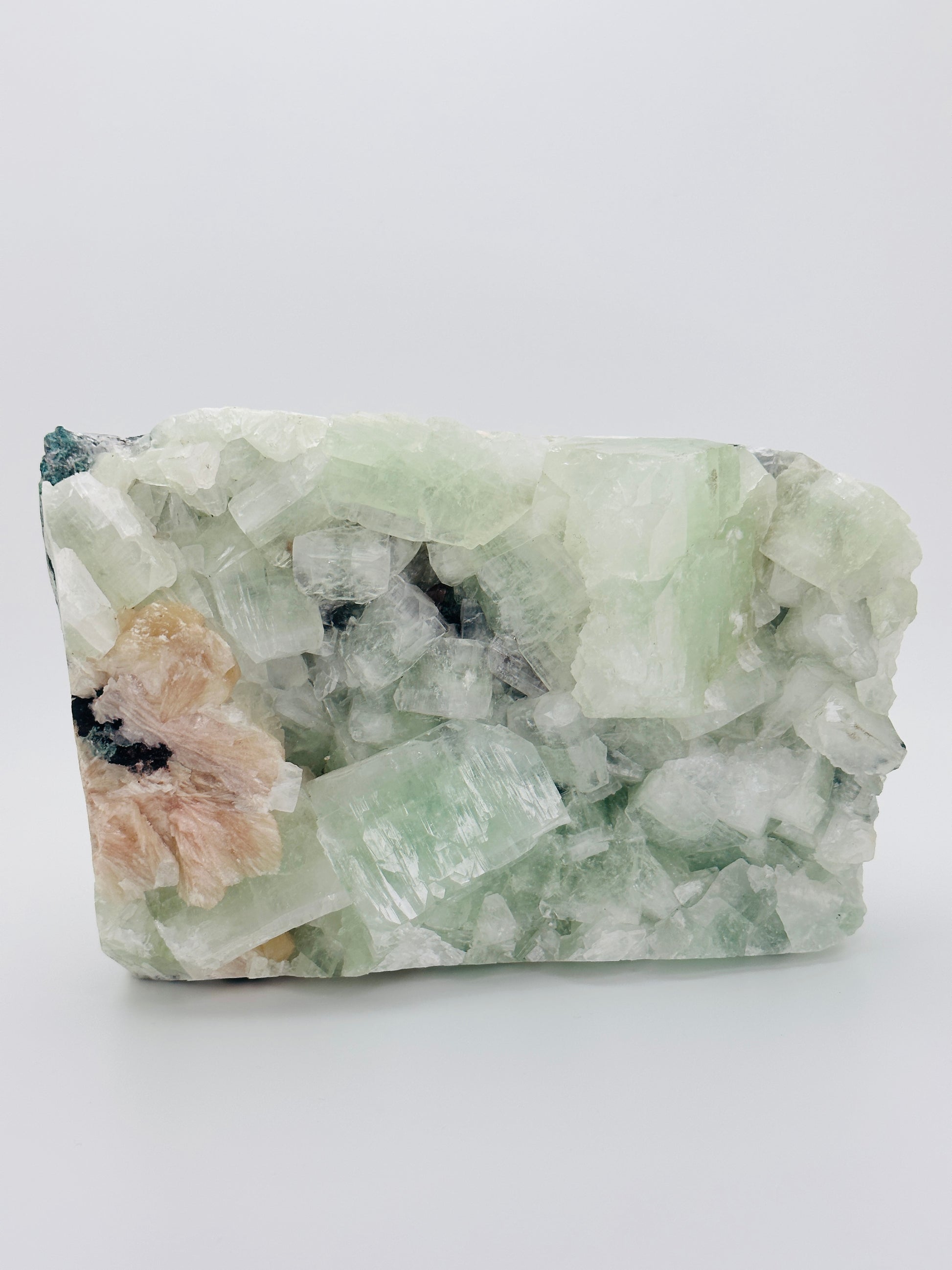 This incredible specimen boasts vibrant cubic Green Apophyllite, Stilbite and a deep red Heulandite inclusion.