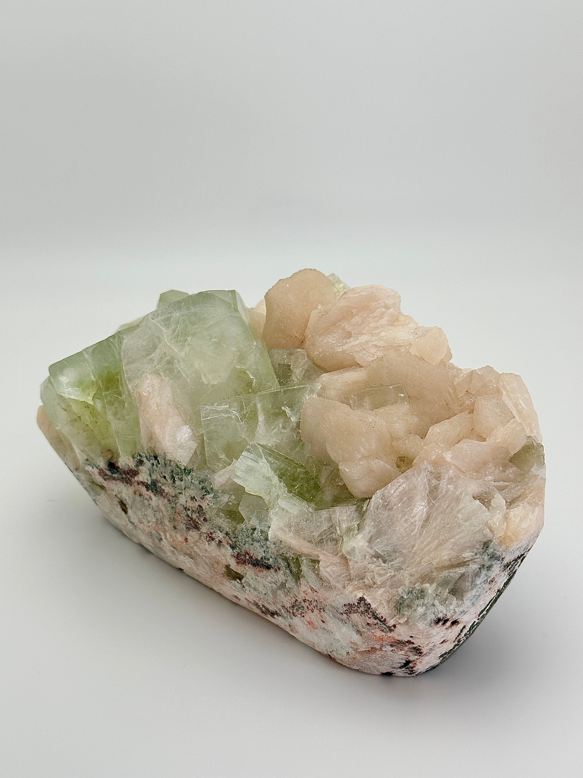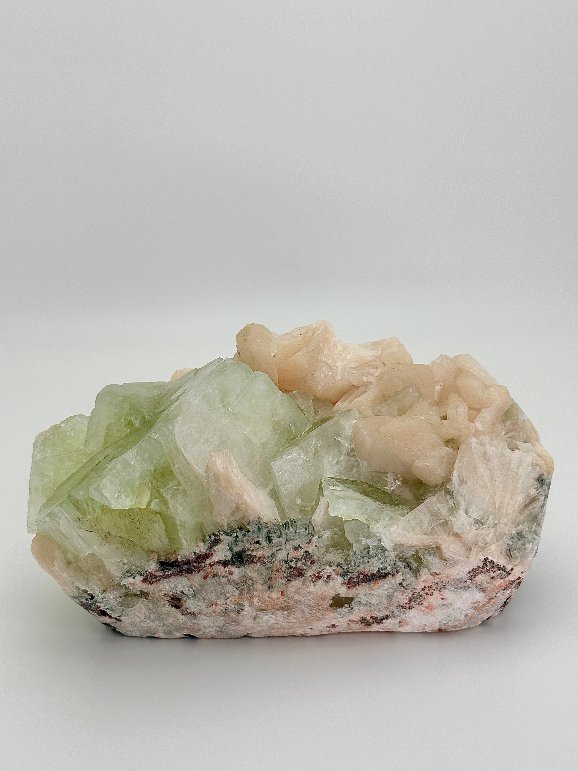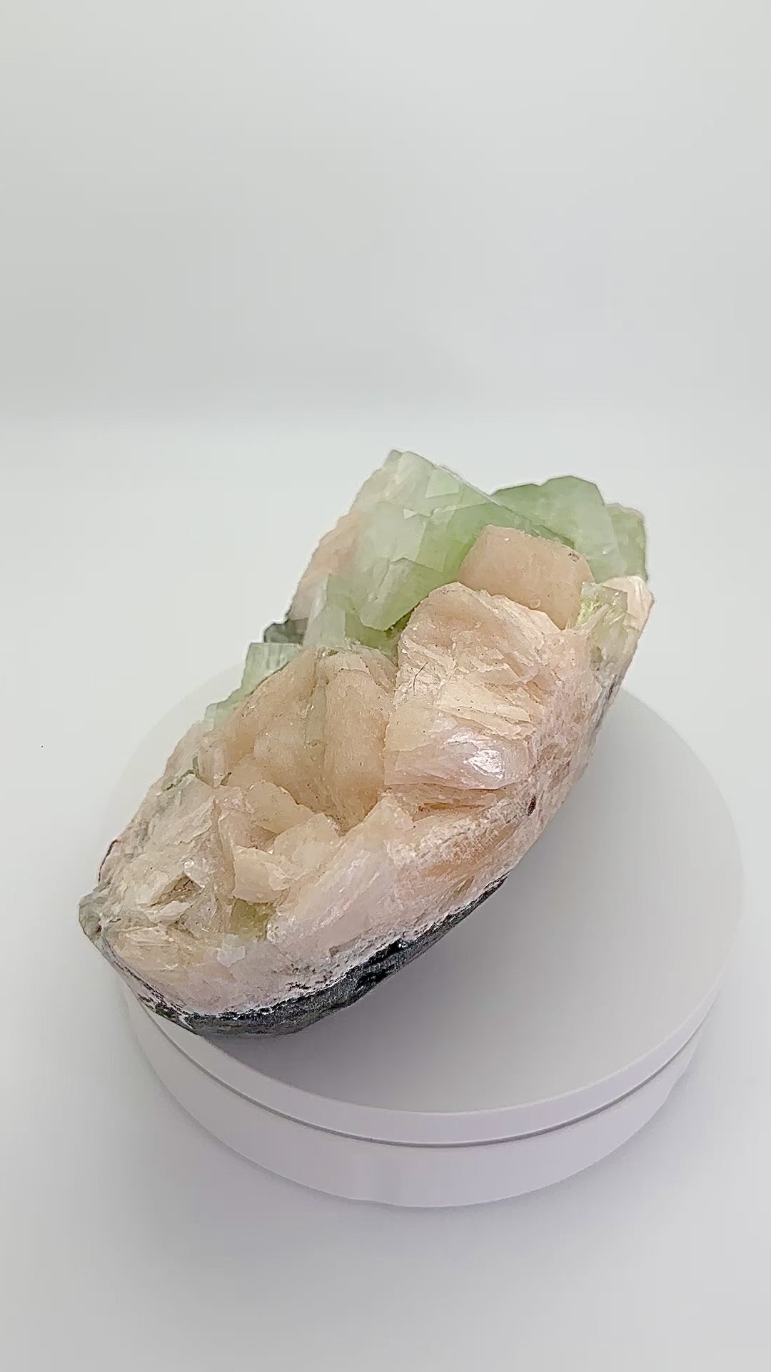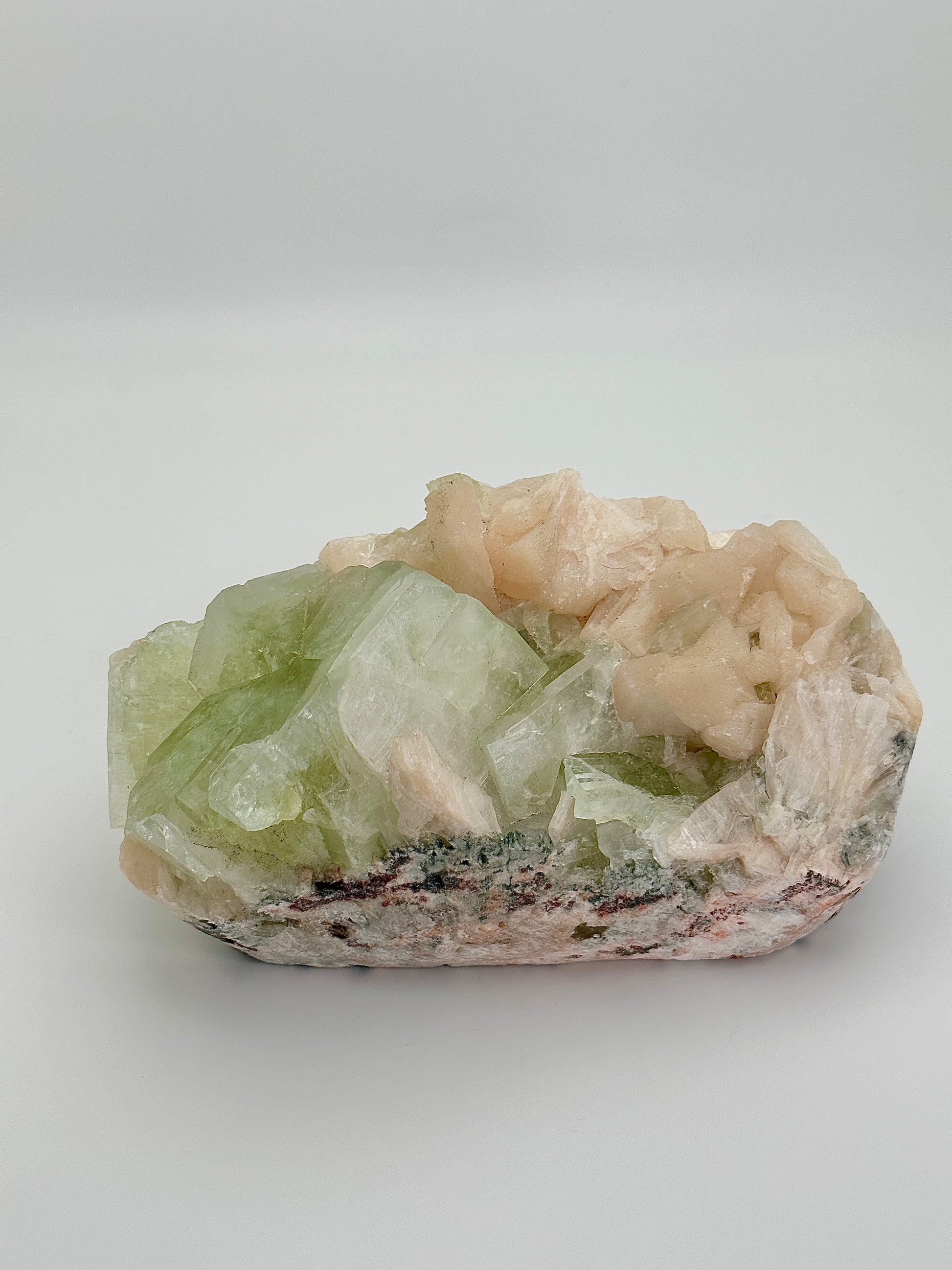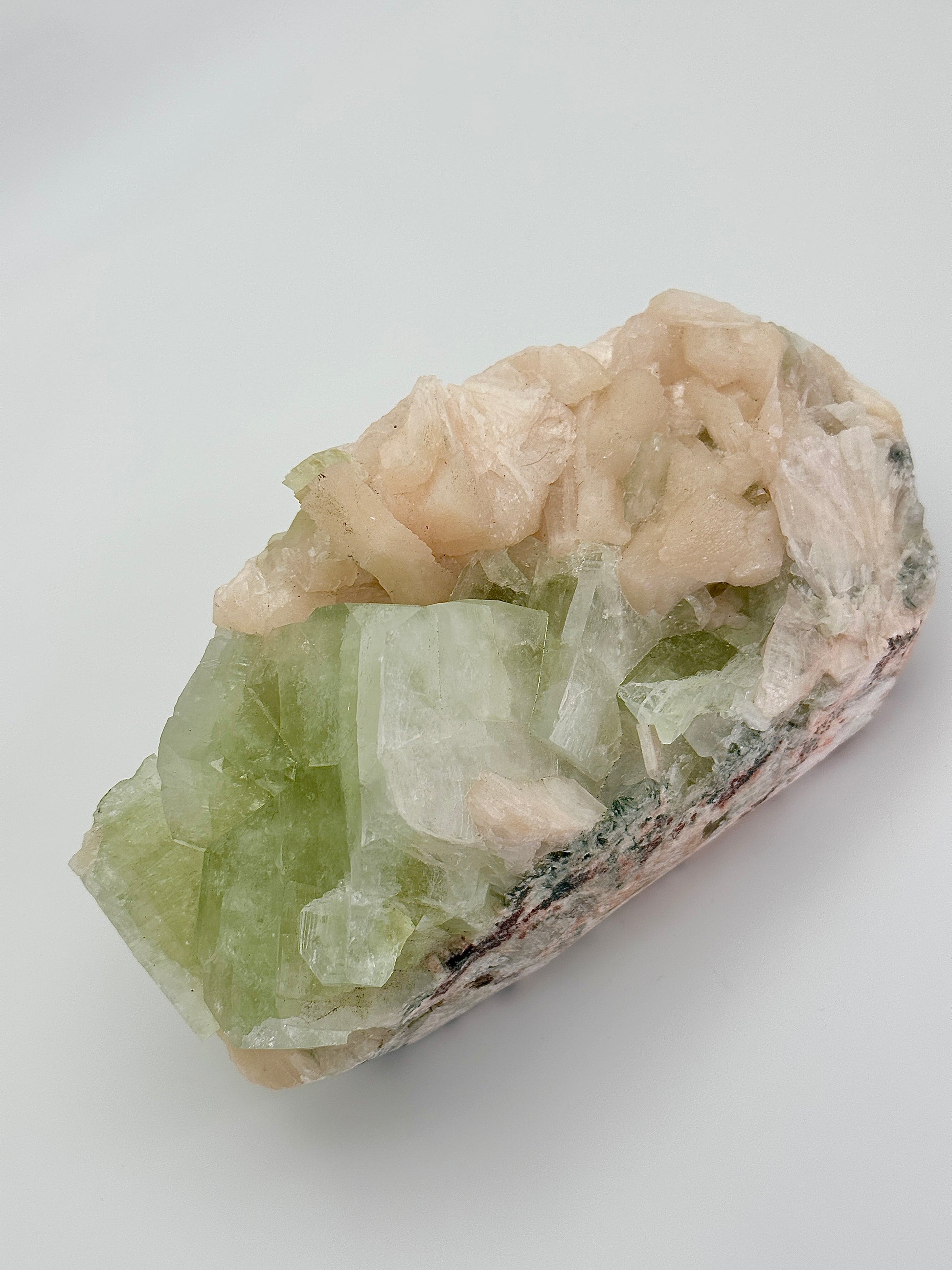 This extraordinary piece is a perfect balance of rich Green Apophyllite and lustrous Stilbite.
