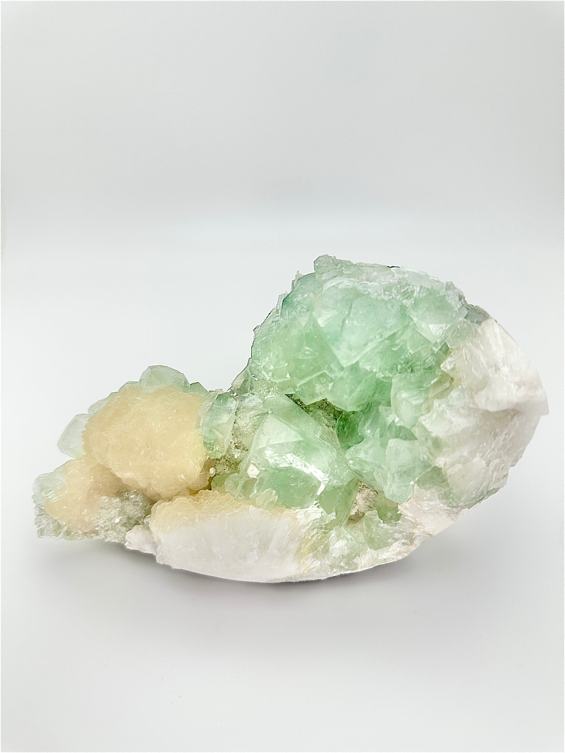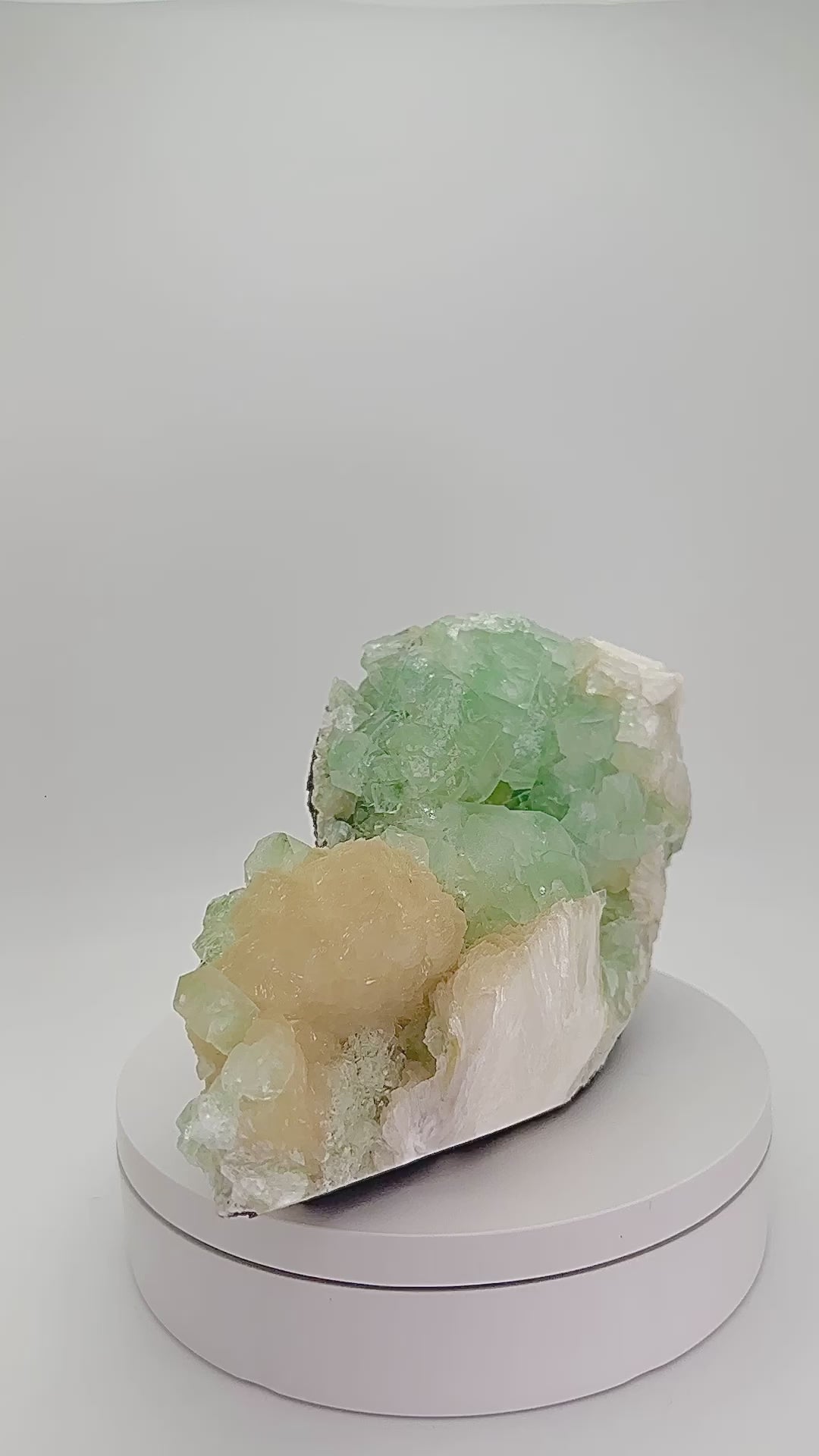 This is one of the most complex specimens of Gemmy cubic Green Apophyllite and Stilbite.